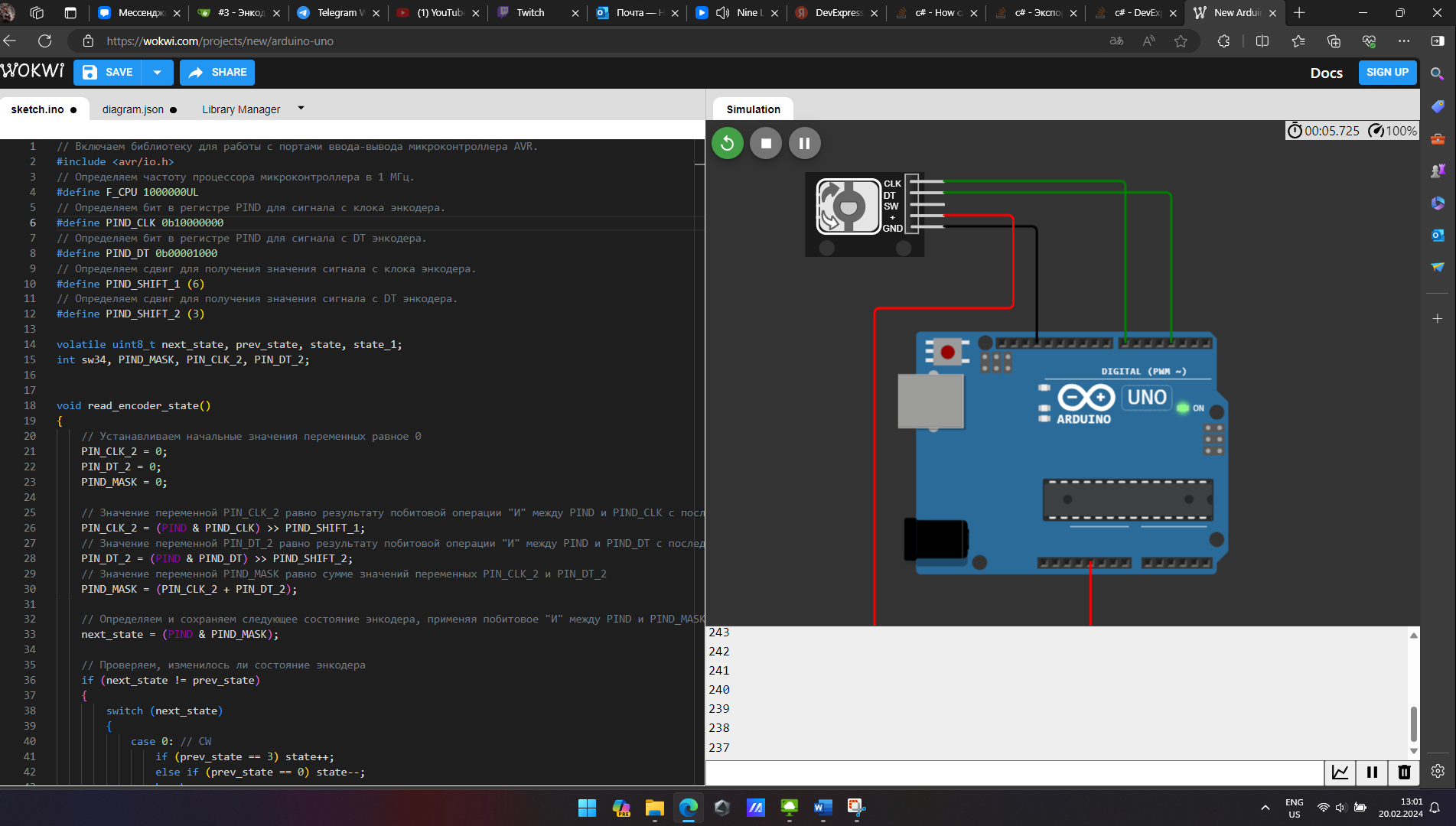 Он будет нам очень быстро возвращать значение state, но так как у нас ENC_CLK подключен к земле все время, то внутрь функции он не попадет, соответственно значение state будет выводиться с большой скоростью, так как задержка тоже не будет учитываться , то он просто будет нам постоянно выводит 0 с очень большой скоростью
