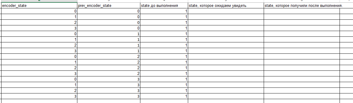 Степан Андреевич, я так и сделал, прогнал все значения через прошлый код и записал их как в таблице в итоге вышло следующее: Начальное положение: encoder_state = 3 prev_encoder_state = 0 state(ож) = 1 state(пол) = 0