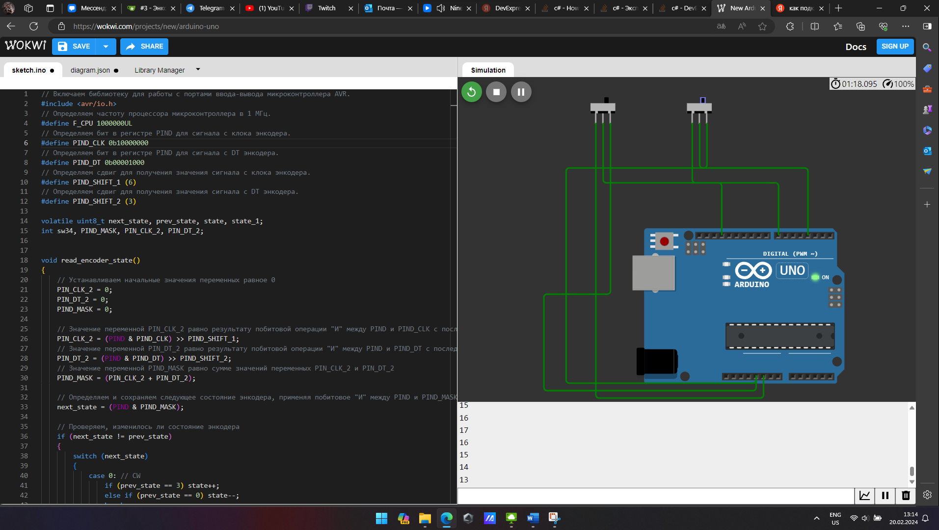 Контакты ктр подключены к ардуино мы заранее определяем, в самом начале программы а затем снимаем с них значения, если мы нажмем на кнопку энкодера клик, то она на пине ENC_CLK выдаст единицу в момент нажатия, аналогично и с DAT_CLK, и в зависимости от комбинации этих значений, наша переменная state будет либо увеличиваться либо уменьшаться, в живой сборке работает корректно и выводит правильные значения